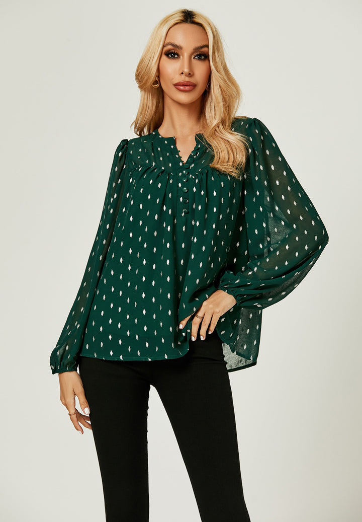 Langarmshirt aus geknittertem Tüll mit Goldfolienknöpfen in Dunkelgrün