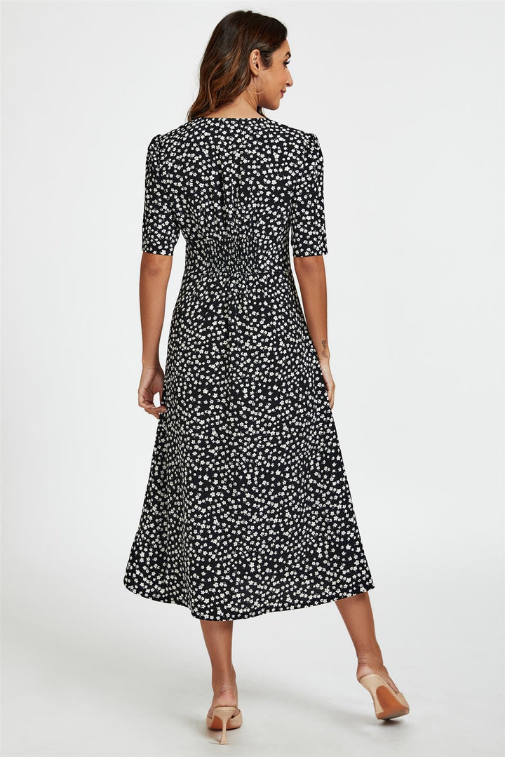 Little – Schwarzes Midikleid mit Blumenmuster und Knopfleiste vorne