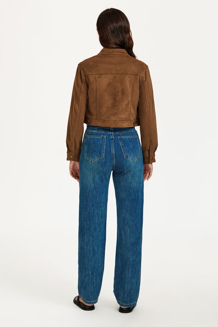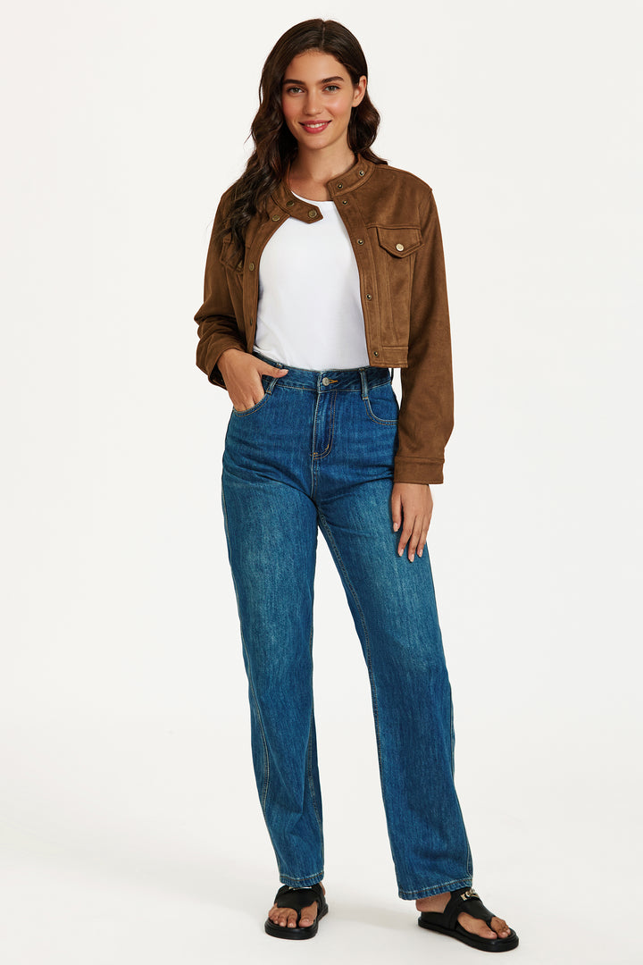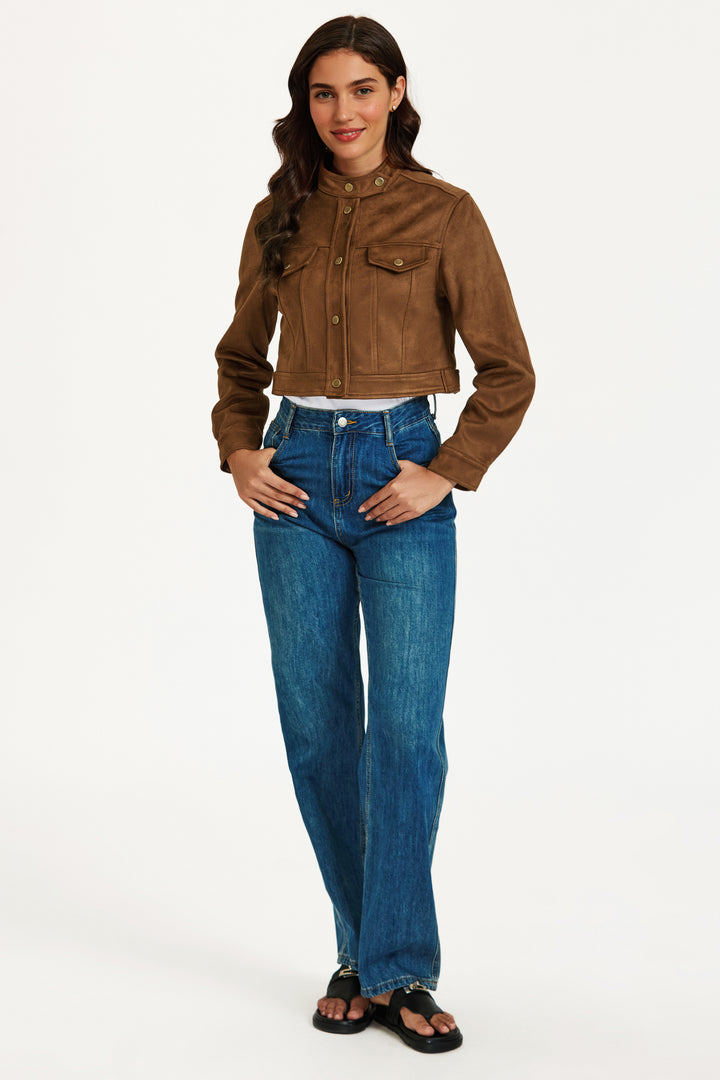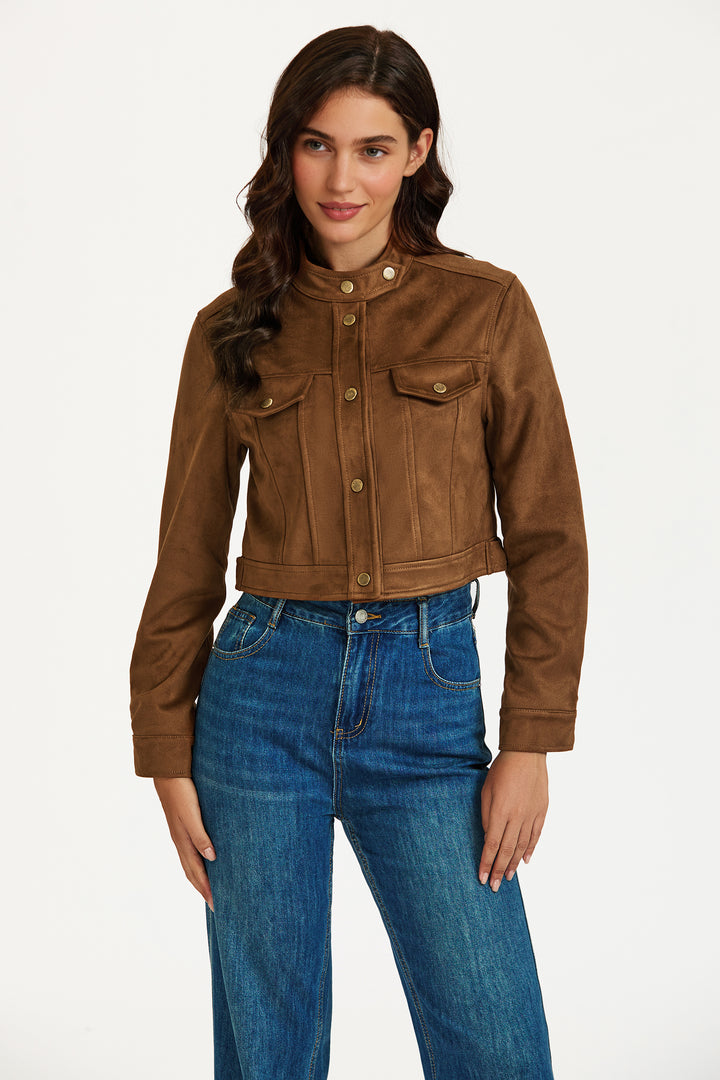 Elevate your everyday look with this chic faux leather cropped jacket. Crafted in a warm brown tone, this jacket features a structured silhouette with a high collar, snap button closure, and classic flap chest pockets for a utilitarian edge. The soft-touch faux leather gives a luxe feel while the cropped cut flatters the waist and pairs effortlessly with high-rise jeans or dresses. Finished with buttoned cuffs and a tailored fit, it’s the perfect piece to transition between seasons in style.