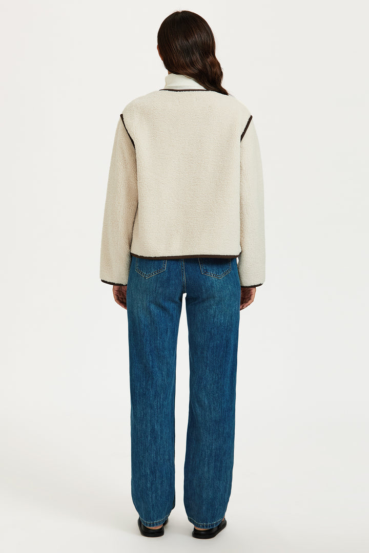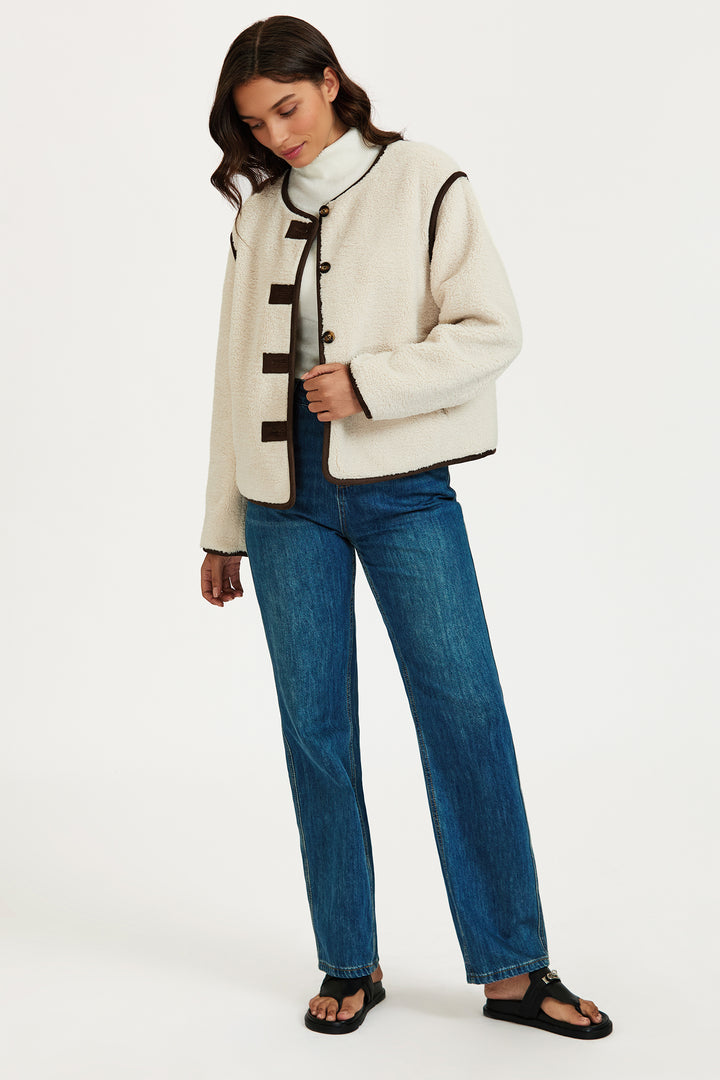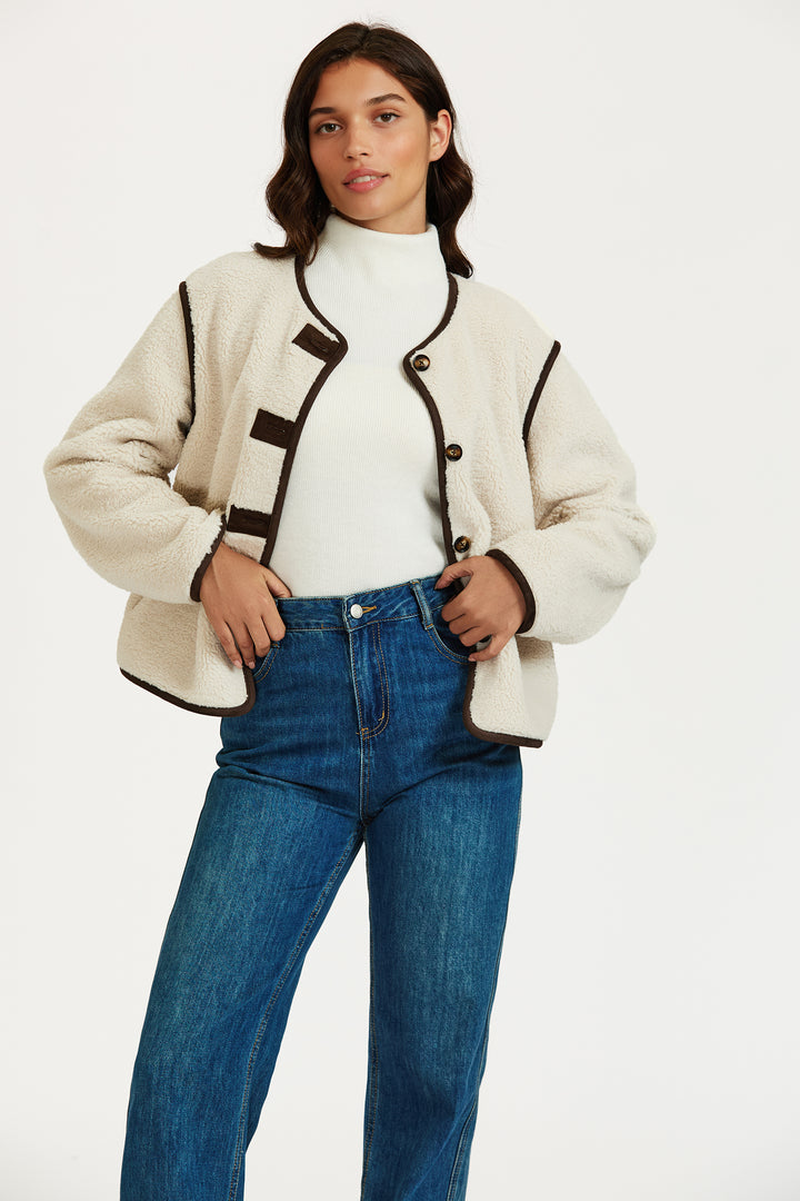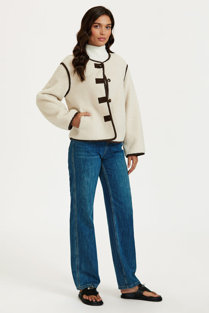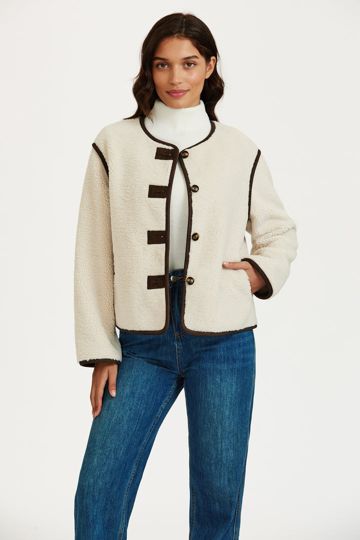 Stay effortlessly chic and cozy with our Faux Shearling Jacket in Cream. Crafted from ultra-soft, textured faux shearling fabric, this jacket features a relaxed silhouette perfect for layering on chilly days. The contrast dark brown trim along the edges, cuffs, and buttons adds a touch of structure and vintage charm. A round neckline and front toggle-style buttons complete the look, offering both comfort and polish. Pair it with denim for casual outings or over a knit dress for an elevated winter look.