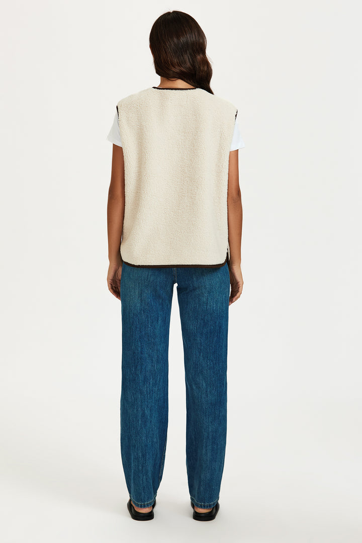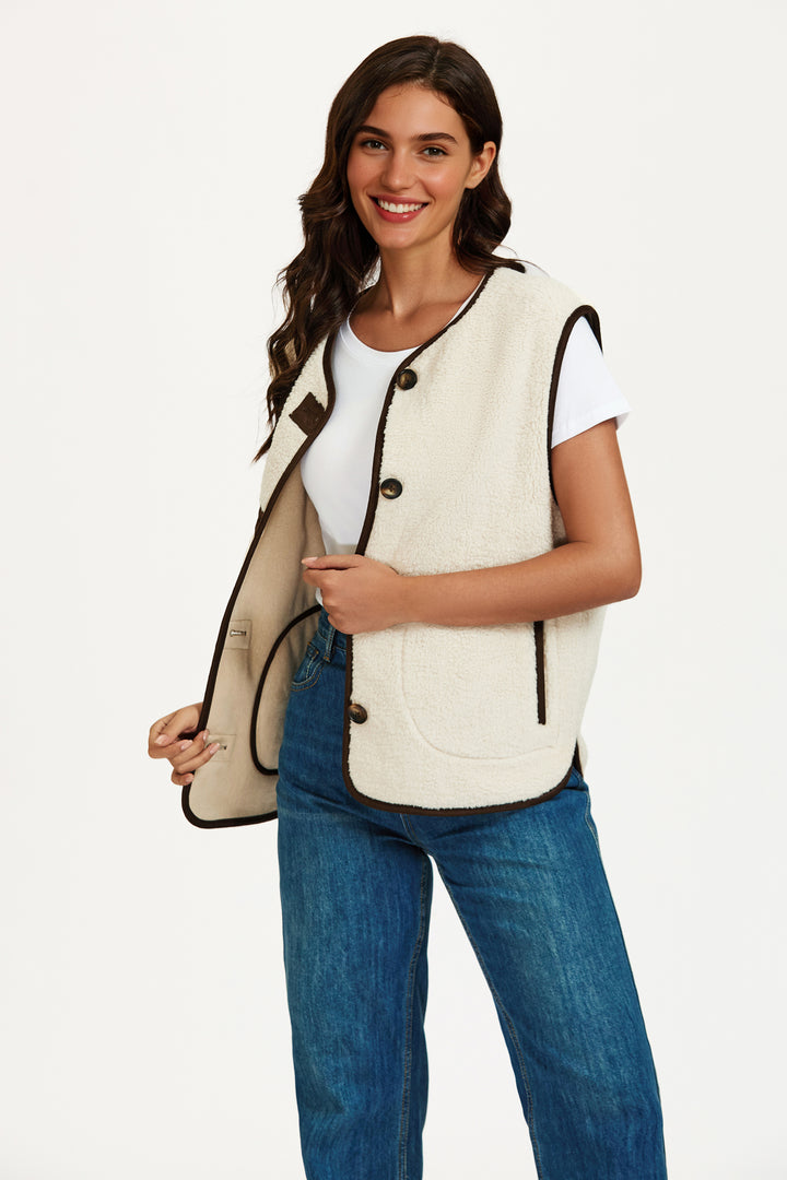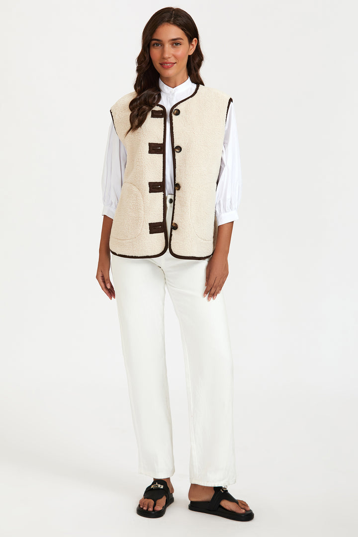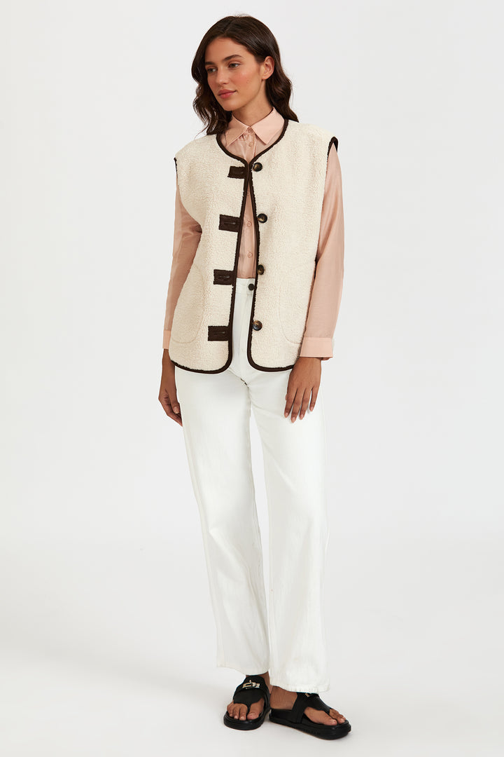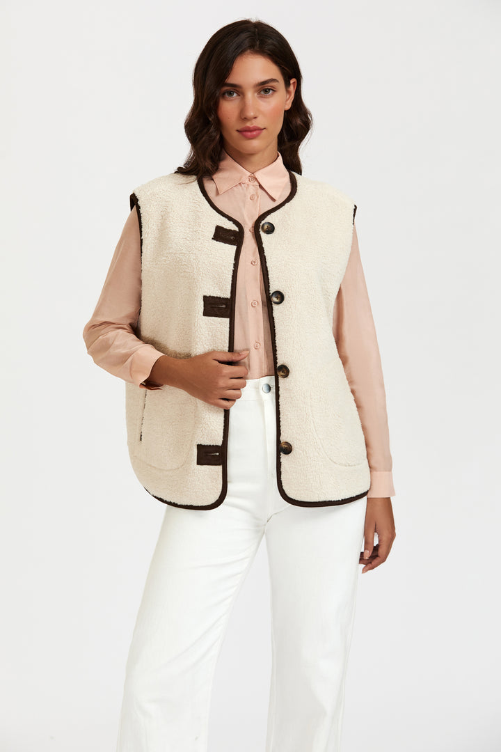 a soft cream hue. Featuring a relaxed silhouette, it’s designed with contrasting brown trims, functional front pockets, and a button-down closure for a rustic-meets-modern look. The tactile teddy texture adds warmth and dimension, while the sleeveless cut makes it perfect for styling over shirts or tees. Whether you’re heading out for a countryside walk or brunch in the city, this versatile piece brings effortless charm to your autumn-winter wardrobe.