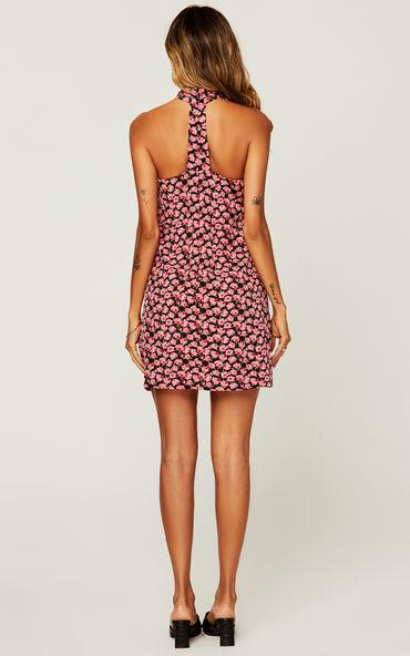 Mini-jurk met halternek en rugdetail in roze rozenprint