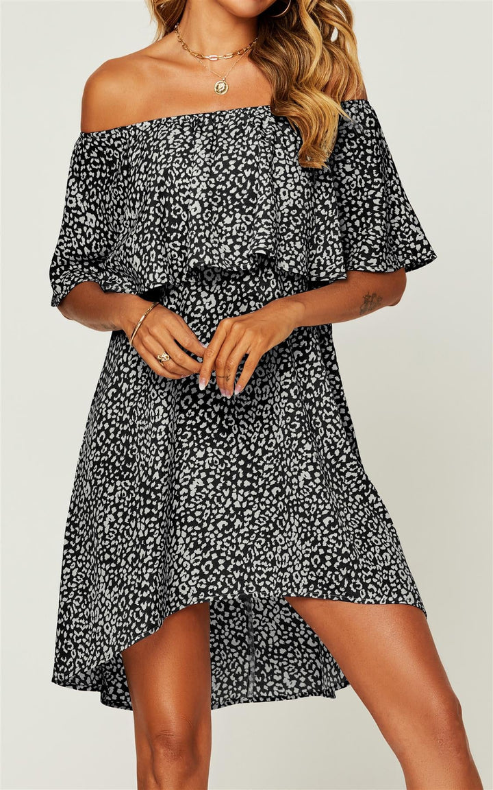 Luipaardprint Bardot-jurk met ruches en off-shoulderprint in zwart