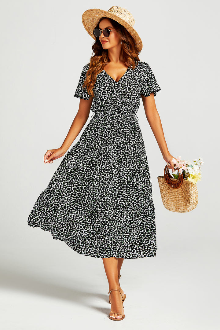 Maak kennis met onze geplooide midi-jurk met geplooide zoom en split, een statement piece voor je garderobe. Deze jurk heeft een flatterende wikkelhals en een gelaagde zoom, versierd met een levendige print, die een vleugje elegantie toevoegt aan je look. De split aan de pijpen voegt een moderne twist toe, zorgt voor bewegingsvrijheid en een vleugje allure. Deze jurk is gemaakt van hoogwaardige stof en biedt zowel comfort als stijl, waardoor hij geschikt is voor diverse gelegenheden. Of je nu naar een brunch met vrienden gaat of naar een speciaal evenement, deze jurk maakt gegarandeerd een blijvende indruk. Combineer hem met hakken voor een verfijnde look of sandalen voor een meer relaxte sfeer. Deze veelzijdige en chique jurk is een must-have voor je collectie.